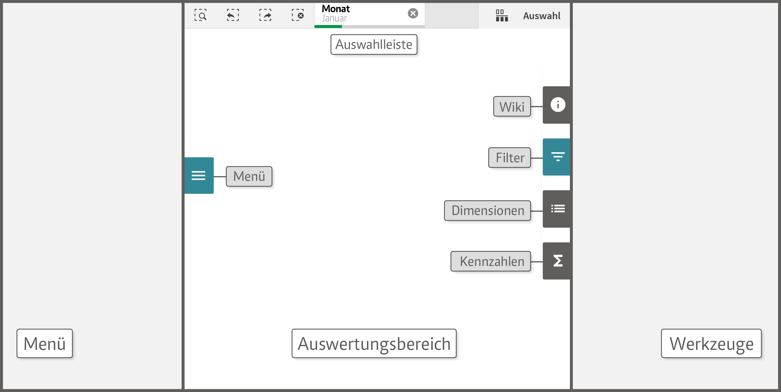 Der Auswertungsbereich in der Mitte ist immer sichtbar. Die Schaltflächen am linken und rechten Rand des Auswertungsbereichs dienen dazu, um das Menü bzw. die Werkzeuge ein- und auszublenden.
