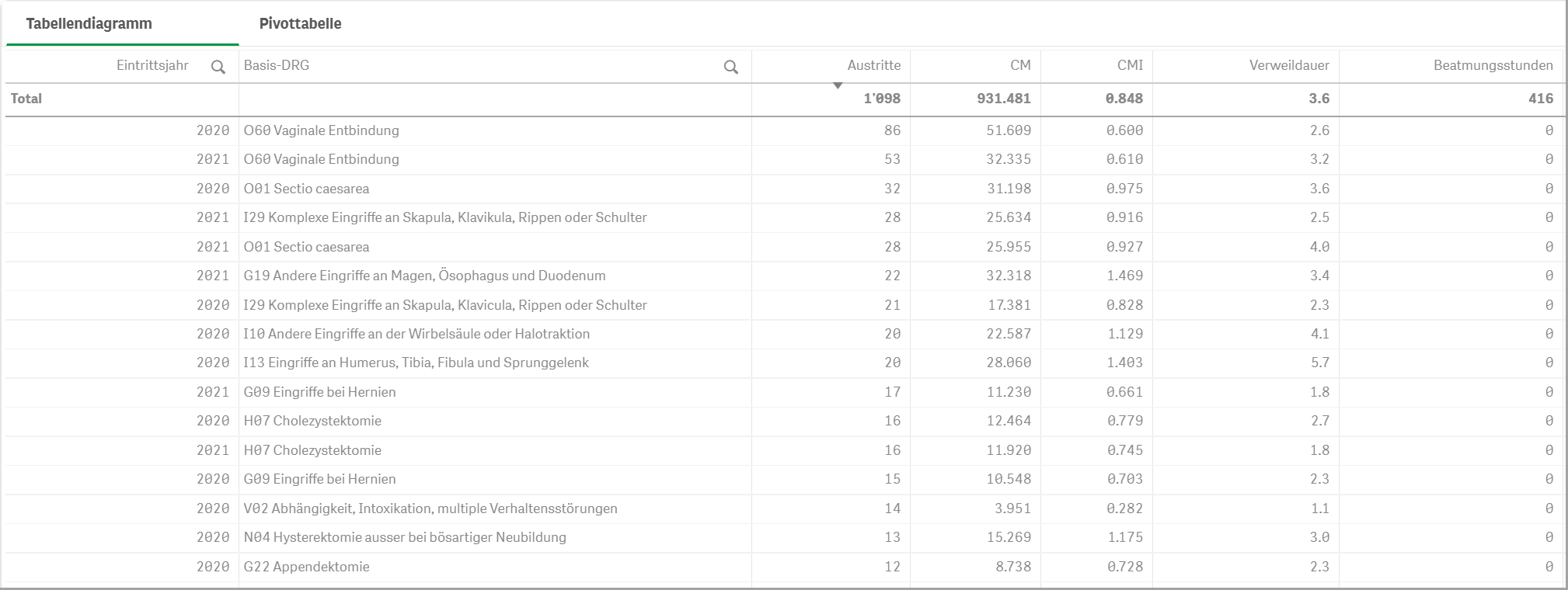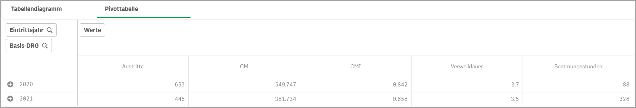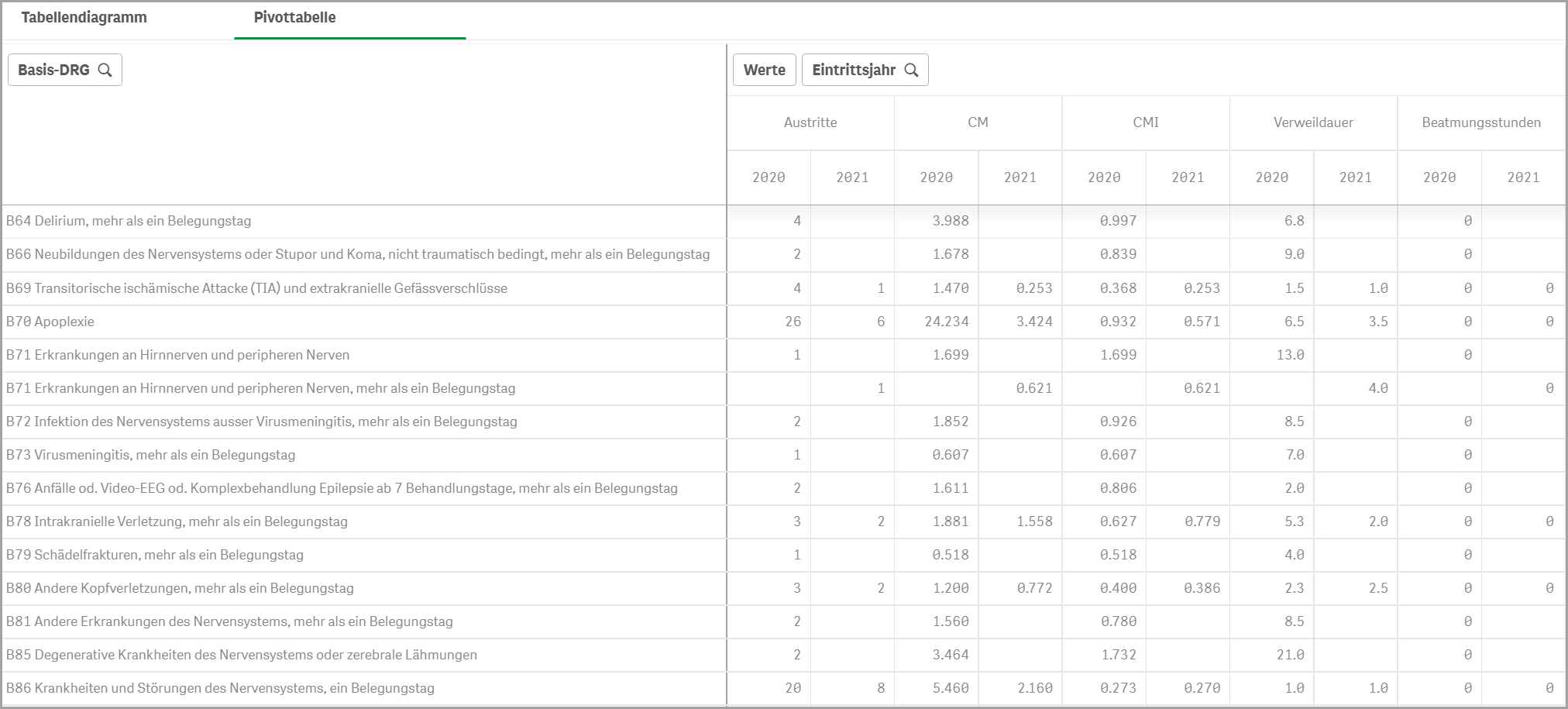 Per Drill Down (+ Zeichen anklicken) wird eine weitere Dimension (Basis DRG) in der Zeile angezeigt.