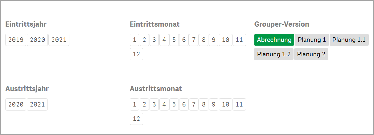 Im oberen Segment des Filterbereichs ist das Eintritts- und Austrittsjahr sowie die Monate und die Grouper-Version wählbar. Im unteren Bereich finden sich die verschiedenen Filterbereiche wider (siehe Navigation).