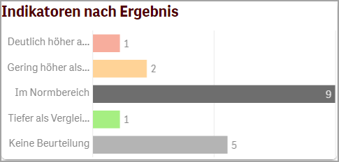 Die Anzahl der Indikatoren nach deren Ergebnissen. Das Bild zeigt die Ausprägungen “Deutlich höher als Vergleichswert“, “Gering höher als Vergleichswert”, “Im Normbereich”, “Tiefer als Vergleichswert” und “Keine Beurteilung” (vgl. hierzu auch die Ausführungen im Kapitel 4 des Handbuchs «Ungeplante Rehospitalisationen»). Nicht alle Ausprägungen müssen vorhanden sein.