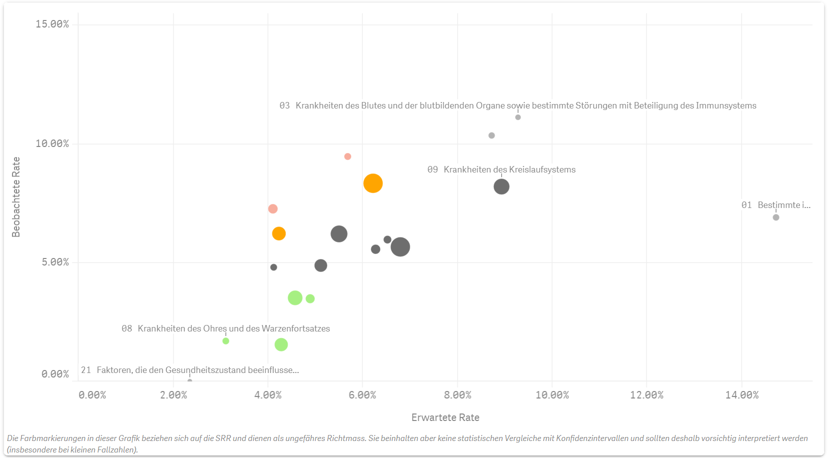 Im Punkt-Diagramm wird die Verteilung gemäss der gewählten Dimension und der Kennzahlen der erwarteten und beobachteten Rate (auf der X- und Y-Achse) dargestellt. Ausreisser können schnell erkannt werden. Die Einfärbung der Punkte bezieht sich auf die Kennzahl SRR (vgl. hierzu auch die Ausführungen im Kapitel 4 des Handbuchs «Ungeplante Rehospitalisationen»). Folgende Angaben finden sich im Diagramm: