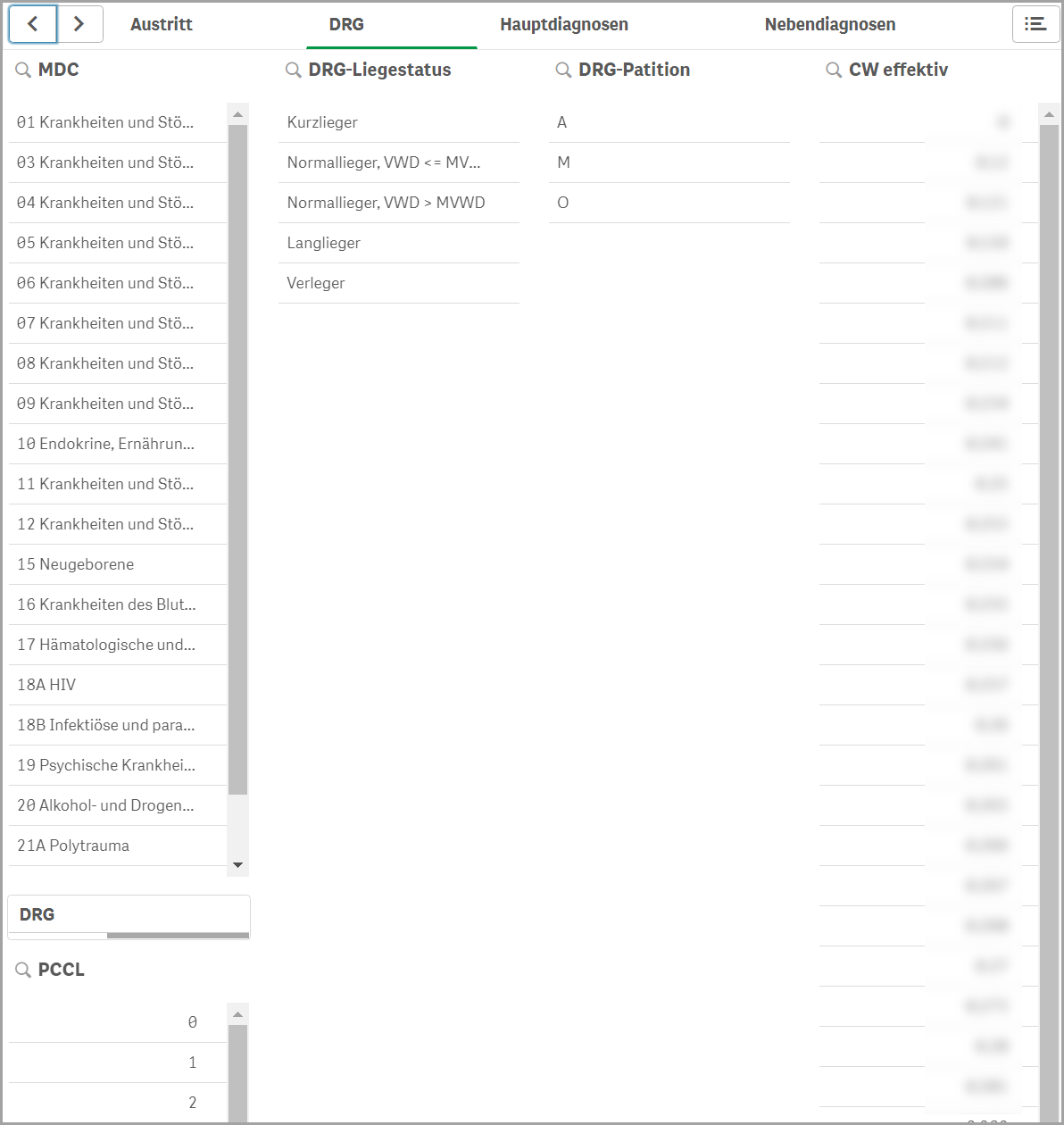Eine Selektion nach MDC, DRG sowie anderen Auswahlmöglichkeiten ist gegeben.